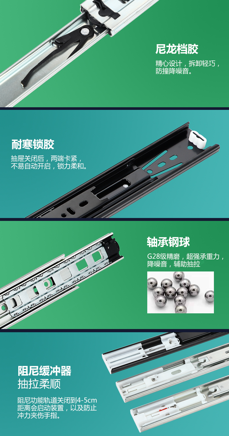 ● 适用于侧面水平安装载重(4512为35kg;4515为45kg)抽拉50000次以上动态运动,闭合抽拉锁力小于3kg/套